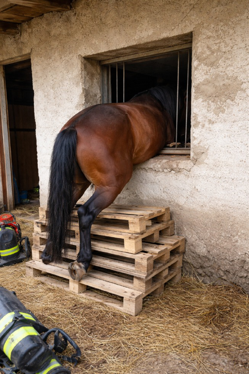 L’episodio è avvenuto intorno alle 8:50, quando l’animale è rimasto incastrato a metà, con parte del corpo all’esterno e parte all’interno della struttura. La situazione ha destato preoccupazione nei proprietari del maneggio, che hanno subito chiesto aiuto per evitare che il cavallo potesse ferirsi.