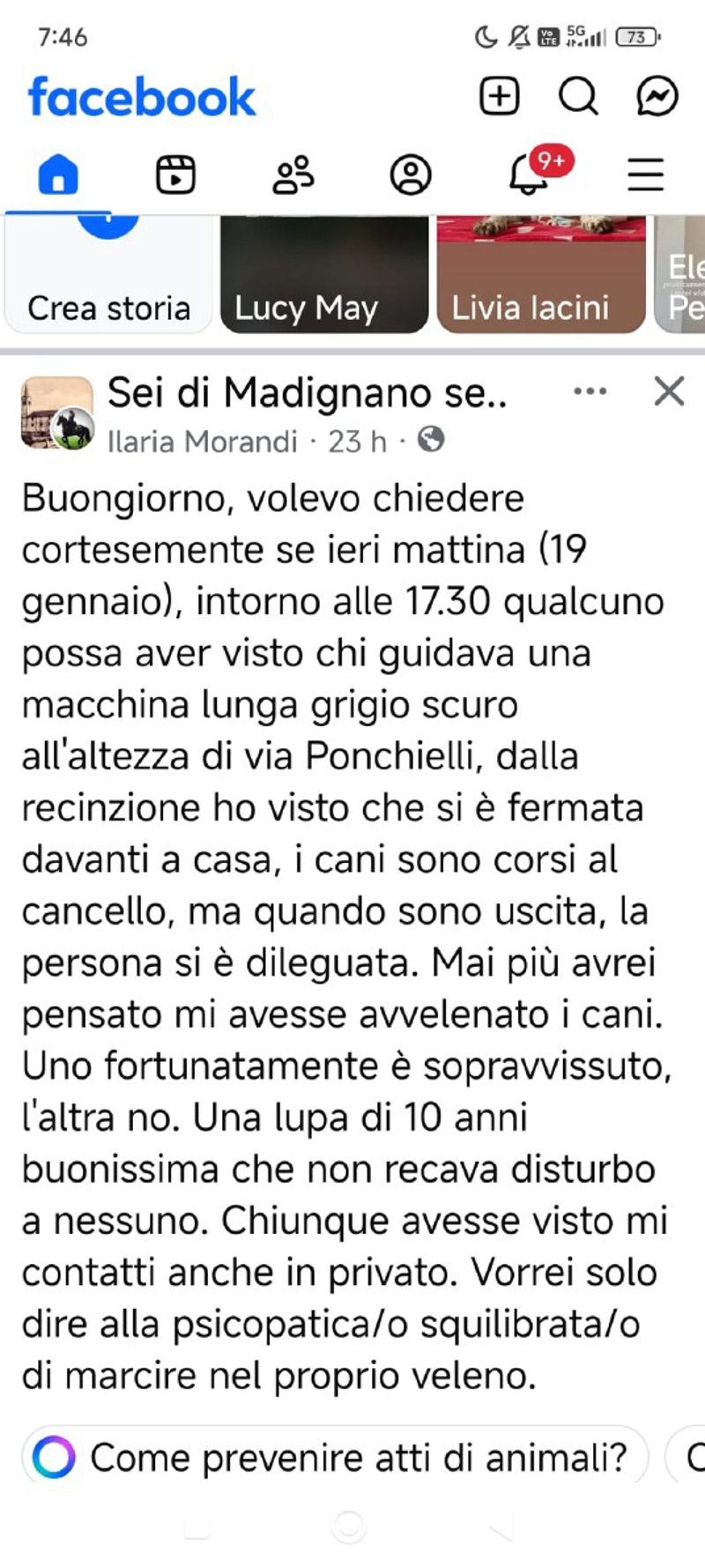 Questo il racconto di Ilaria, la proprietaria dei due cani che lunedì sarebbero stati avvelenati da una persona arrivati in auto e subito ripartita.
