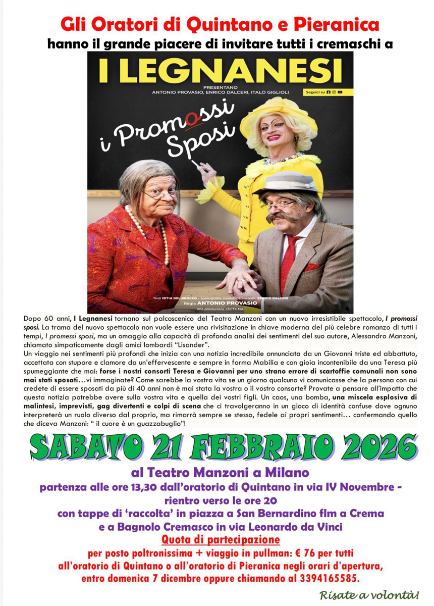 Uscita organizzata dagli Oratori di Quintano e Pieranica per assistere allo spettacolo al Teatro Manzoni. Partenza alle 13:30 dall’oratorio di Quintano, via IV Novembre; fermate di raccolta in piazza a San Bernardino (Crema) e a Bagnolo Cremasco in via Leonardo da Vinci. Rientro previsto verso le 20.