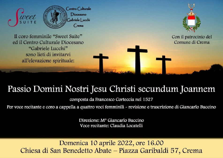Domenica 10 aprile alle ore 16. il coro femminile Sweet Suite si esibirà presso la chiesa di S. Benedetto a Crema in un concerto-meditazione, eseguendo Passio Domini nostri Jesu Christi secundum Joannem di Francesco Corteccia, risalente al 1527. La Passione secondo Giovanni è il più antico esempio di composizione di Passione ad opera di un maestro italiano in chiaro stile palestriniano.