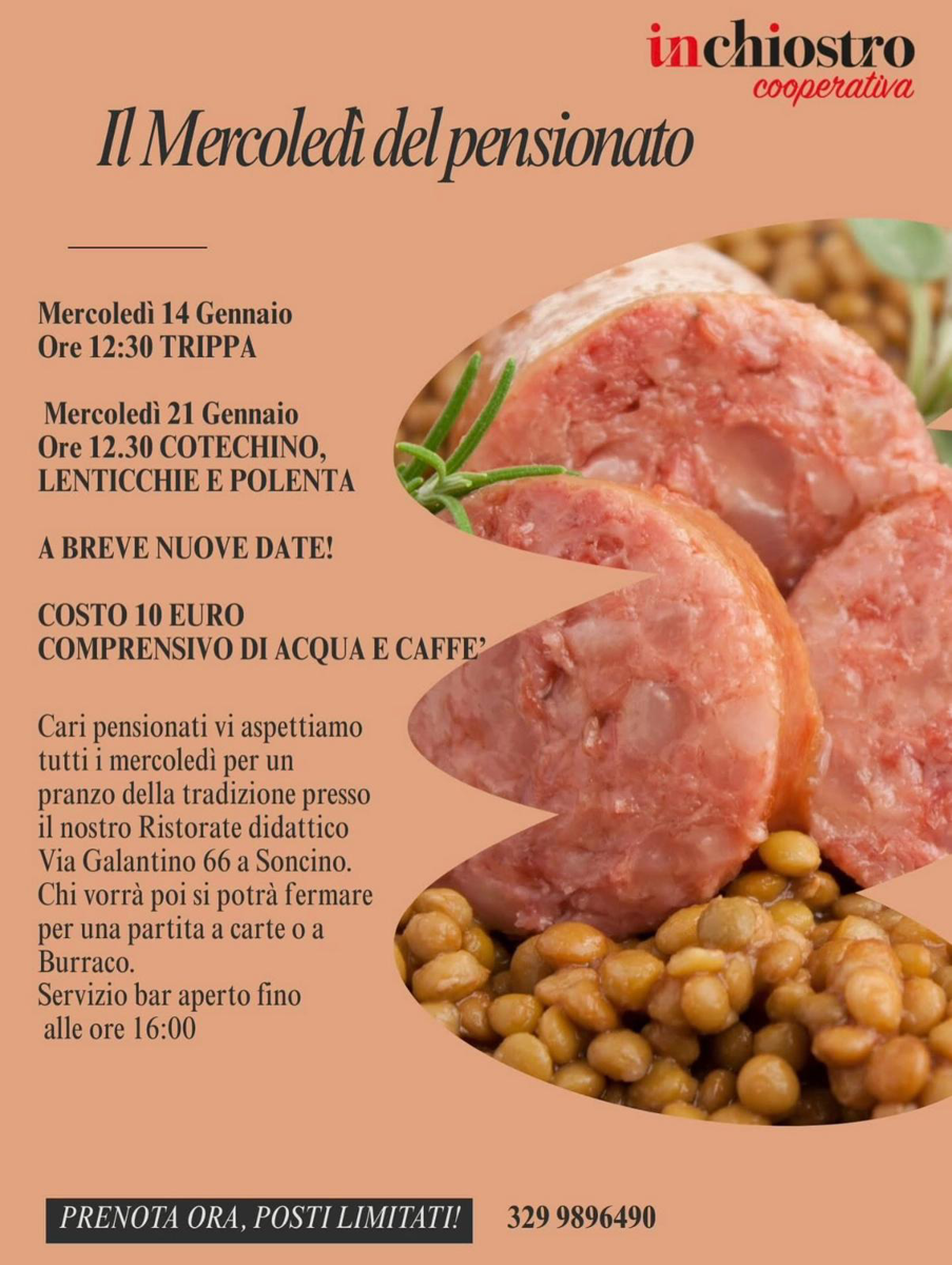 Pranzo tradizionale per pensionati con piatto del giorno: trippa. Posti limitati. Possibilità di fermarsi per giocare a carte. Servizio bar aperto fino alle 16:00.