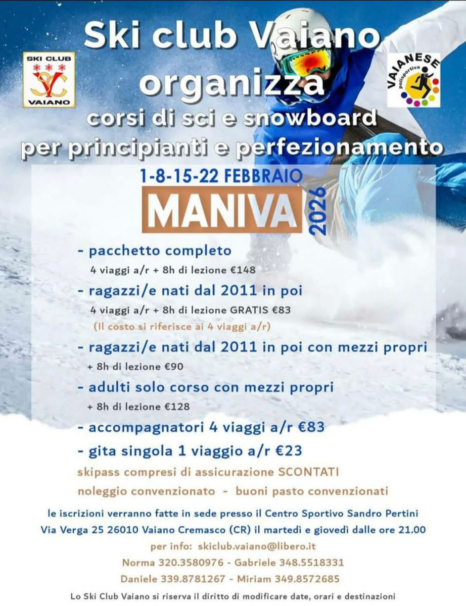 Corso per principianti e perfezionamento organizzato dallo Ski Club Vaiano. Pacchetto 4 viaggi e 8ore di lezione €148. Nati dal 2011: lezioni gratis, bus €83. Con mezzi propri: ragazzi €90, adulti €128. Accompagnatori 4 viaggi €83; gita singola €23. Skipass scontati; noleggio e buoni pasto convenzionati. Date e destinazioni soggette a variazioni.