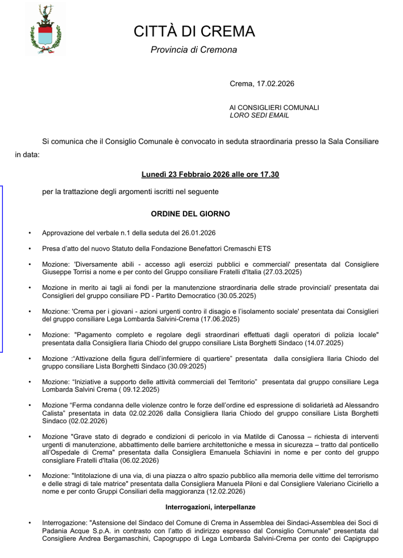 Convocazione per la trattazione dell’ordine del giorno: approvazione verbale 26/01/2026; nuovo Statuto Fondazione Benefattori Cremaschi ETS; mozioni su accessibilità per persone con disabilità, manutenzione strade provinciali, politiche giovanili contro disagio e isolamento, pagamento straordinari polizia locale, infermiere di quartiere, sostegno alle attività commerciali, condanna delle violenze contro le forze dell’ordine; degrado e sicurezza in via Matilde di Canossa e Ospedale di Crema; intitolazione di una via/piazza alle vittime del terrorismo; interrogazioni e interpellanze.