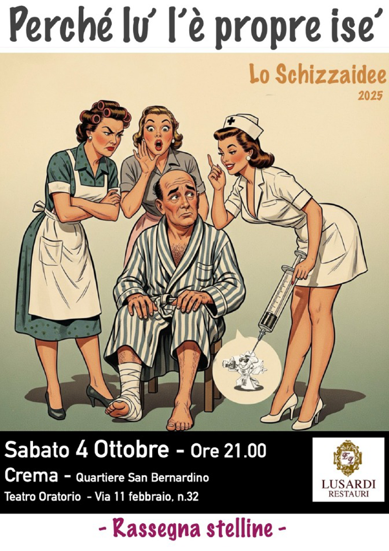 Sabato prossimo (04 ottobre) sul palcoscenico del teatro di S. Bernardino arriva la compagnia degli Schizzaidee di Bolzone che porta in scena il suo ultimo lavoro Perché lu l'è propre isé, commedia dialettale sicuramente comica che narra delle vicissitudini di un uomo alle prese con la tecnologia moderna e delle sue esilaranti incomprensioni. Tra bizzarri effetti inaspettati, la sua quotidianità si trasforma in un vortice di situazioni paradossali che coinvolgono amici, vicini e persino professionisti insospettabili. Per gli spettatori in sala ci sarà una carrellata di equivoci e colpi di scena, dove il caos regna sovrano e il buonumore è garantito, dimostrando che, in fondo, lù l'è propre isé...!