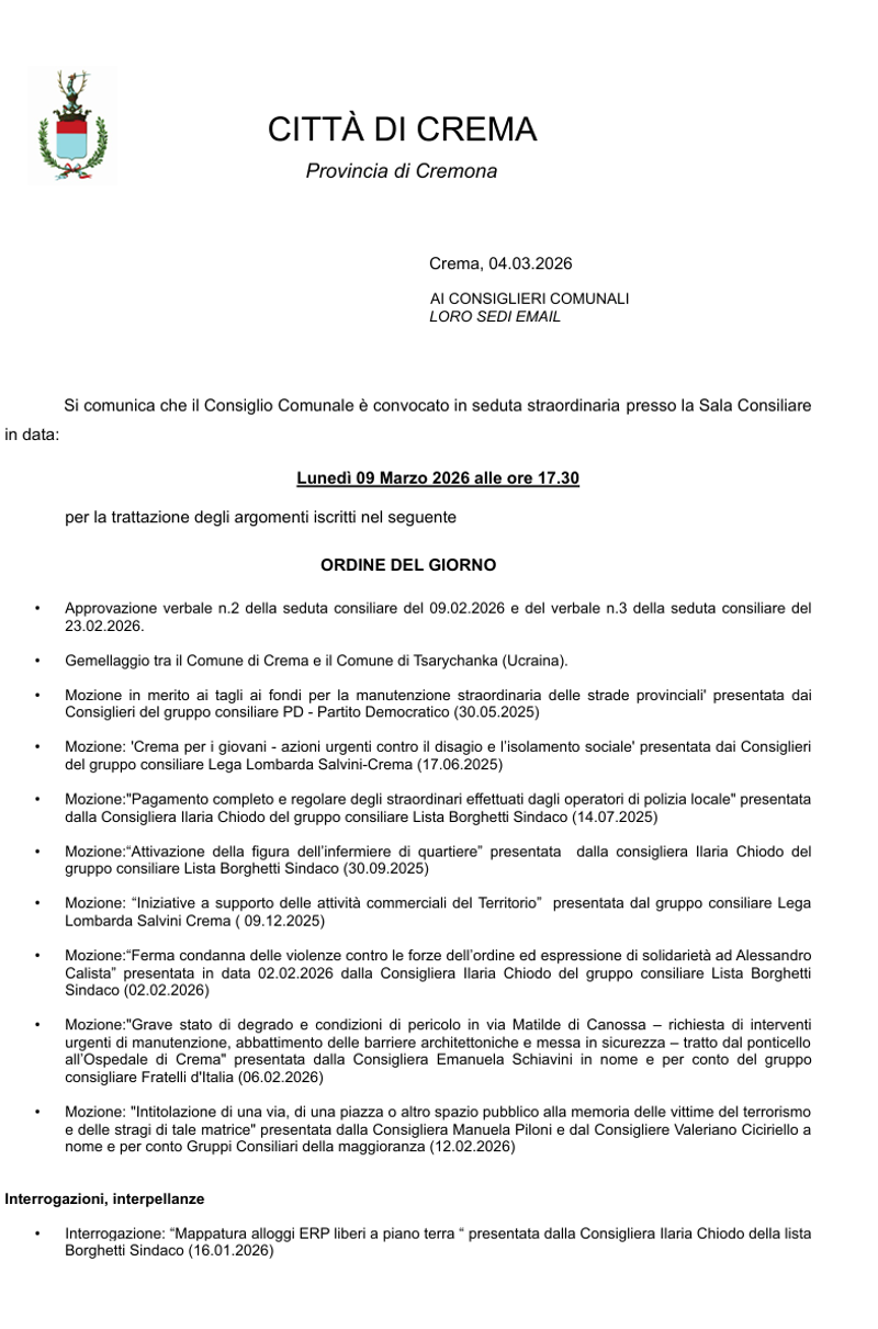 Seduta straordinaria con ordine del giorno che comprende: approvazione dei verbali 09.02.2026 e 23.02.2026; gemellaggio con Tsarychanka (Ucraina); mozioni su fondi per manutenzione strade provinciali, azioni per i giovani contro disagio/isolamento, pagamento straordinari polizia locale, attivazione infermiere di quartiere, sostegno alle attività commerciali; condanna delle violenze contro le forze dell’ordine e solidarietà ad Alessandro Calista; interventi in via Matilde di Canossa; intitolazioni in memoria delle vittime del terrorismo; interrogazione su mappatura alloggi Erp liberi a piano terra.