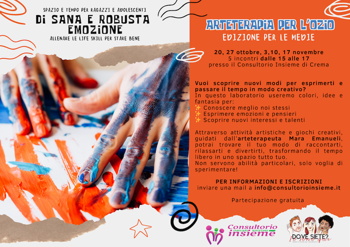 Laboratorio di arteterapia per ragazze e ragazzi delle medie, guidato dall’arteterapeuta Mara Emanuelli. Attività artistiche e giochi creativi per esprimere emozioni, conoscersi meglio e scoprire interessi e talenti. Percorso di 5 incontri.