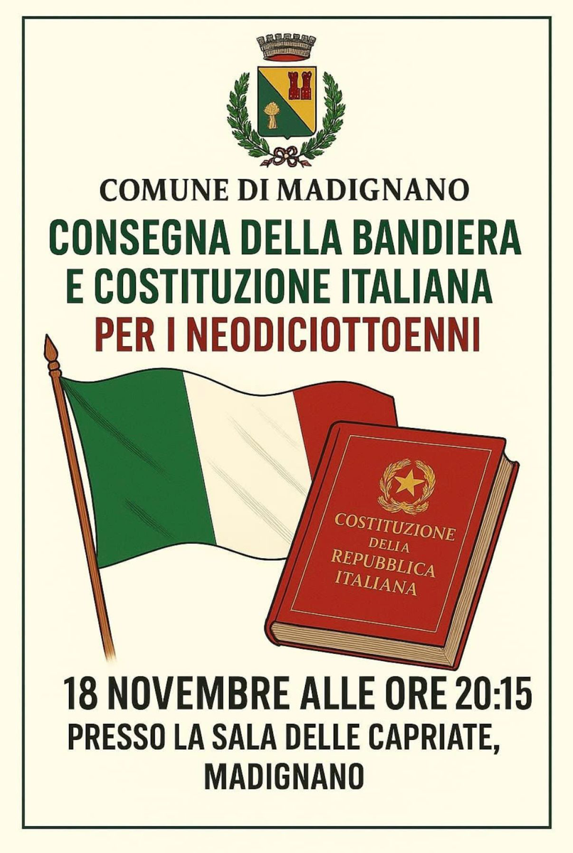 Cerimonia del comune di Madignano per la consegna della bandiera e della Costituzione Italiana ai neo diciottenni.