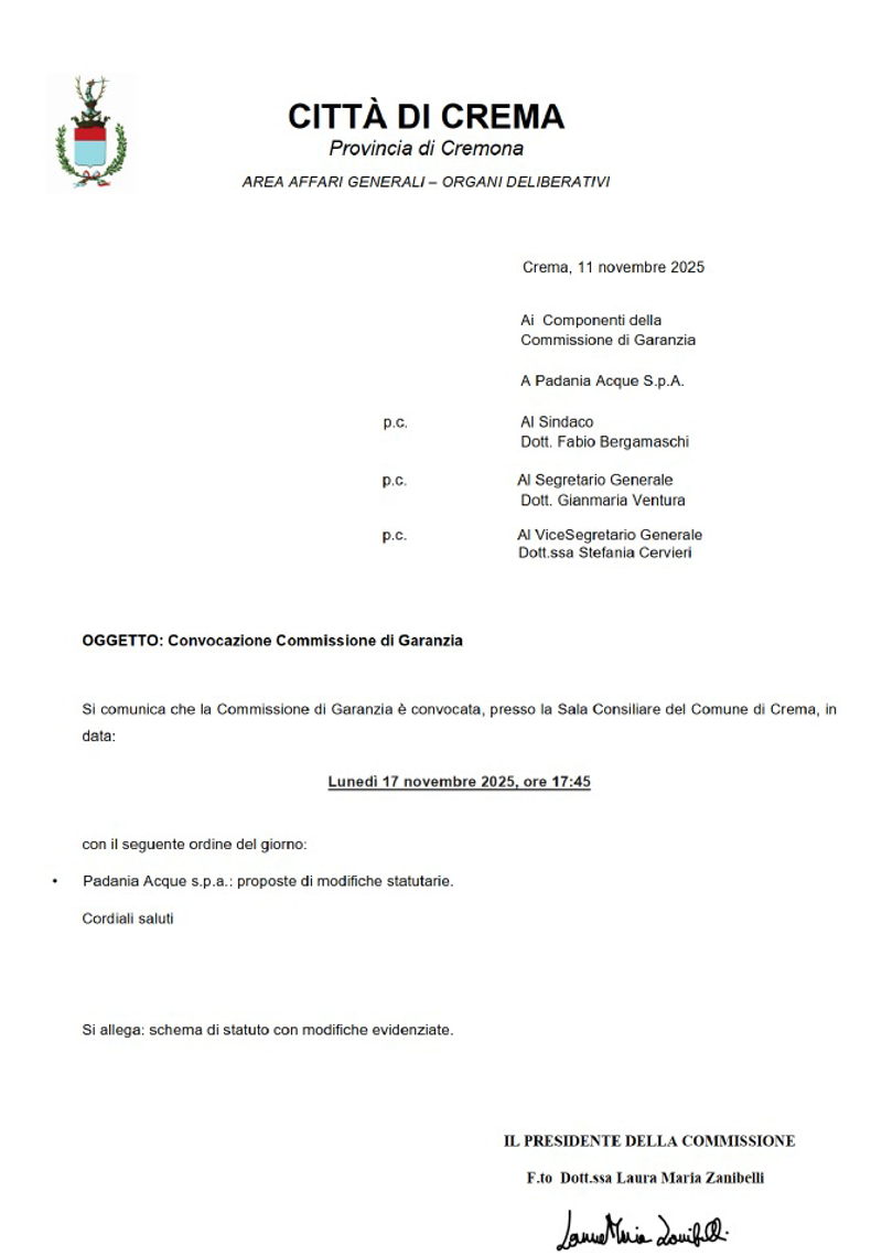 La commissione di garanzia è convocata. Padia acque spa: proposte di modifiche statutarie.