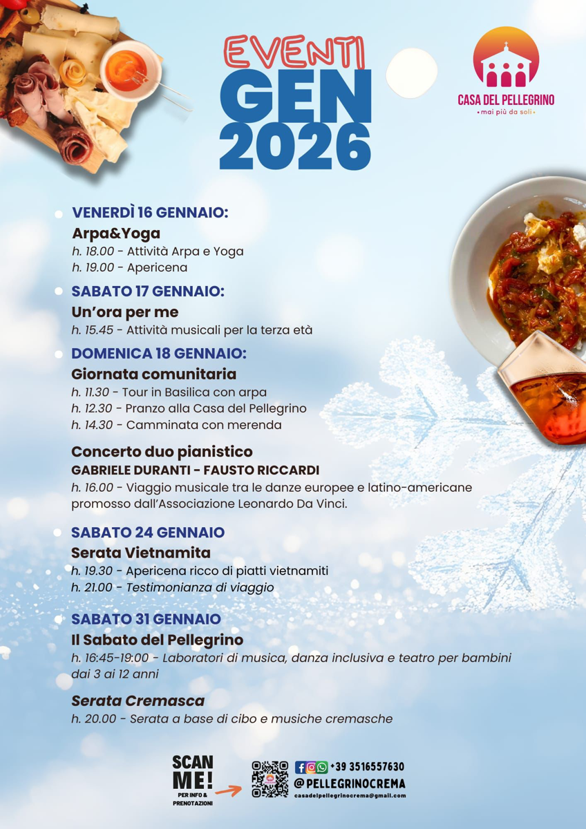 Info e prenotazioni: 351 655 7630, casadelpellegrinocrema@gmail.com