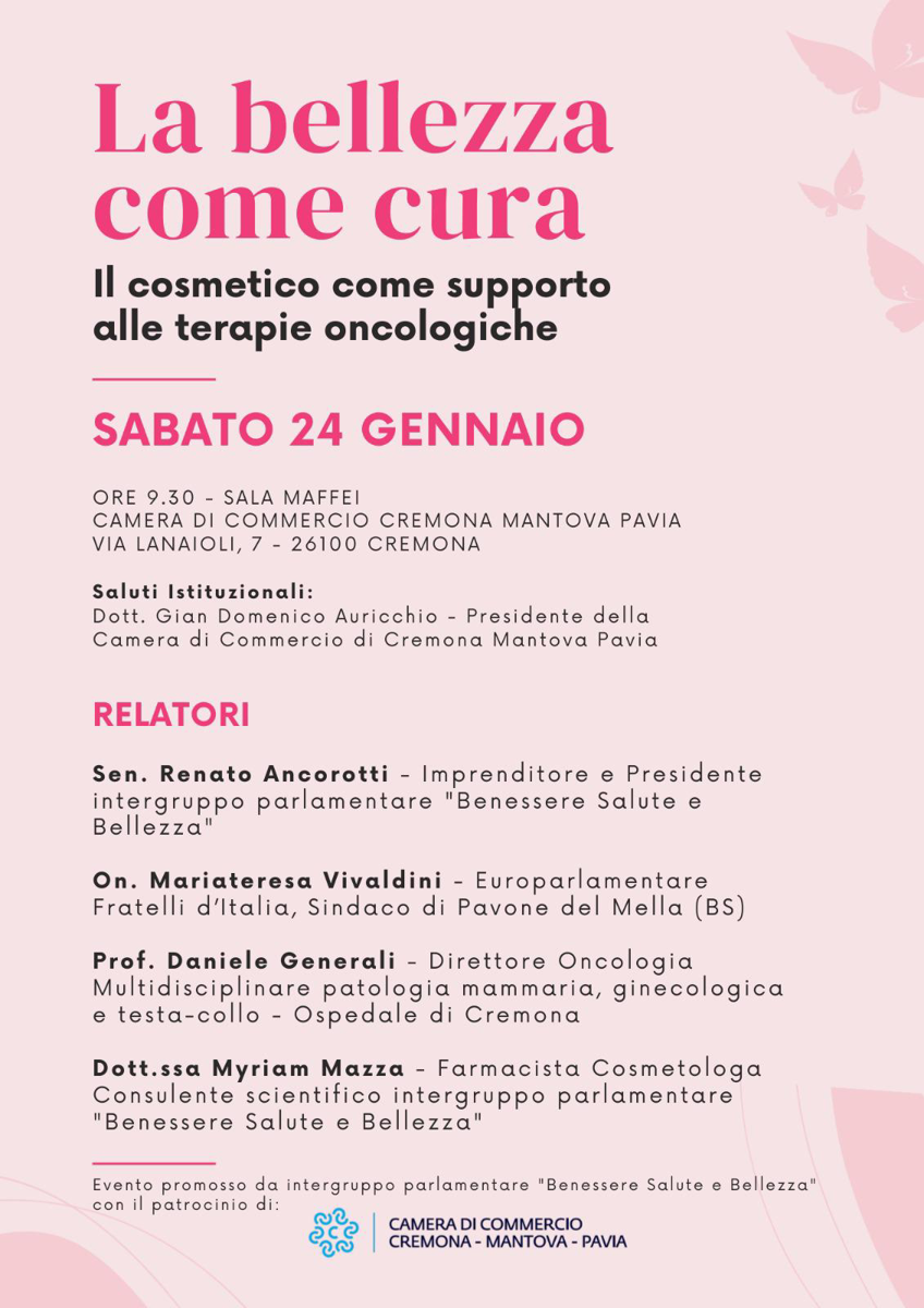 Conferenza sul ruolo del cosmetico a supporto delle terapie oncologiche, con saluti istituzionali di Gian Domenico Auricchio (Presidente Camera di Commercio). Interventi di Renato Ancorotti, Mariateresa Vivaldini, Daniele Generali e Myriam Mazza.