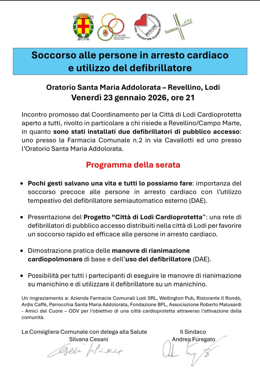 Presentazione della rete Città di Lodi Cardioprotetta e dei due nuovi Dae di pubblico accesso (Farmacia Comunale n.2 in via Cavallotti e Oratorio S. Maria Addolorata).