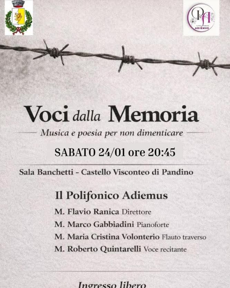 Musica e poesia per non dimenticare con Il Polifonico Adiemus: direttore Flavio Ranica; Marco Gabbiadini (pianoforte); Maria Cristina Volonterio (flauto traverso); Roberto Quintarelli (voce recitante).