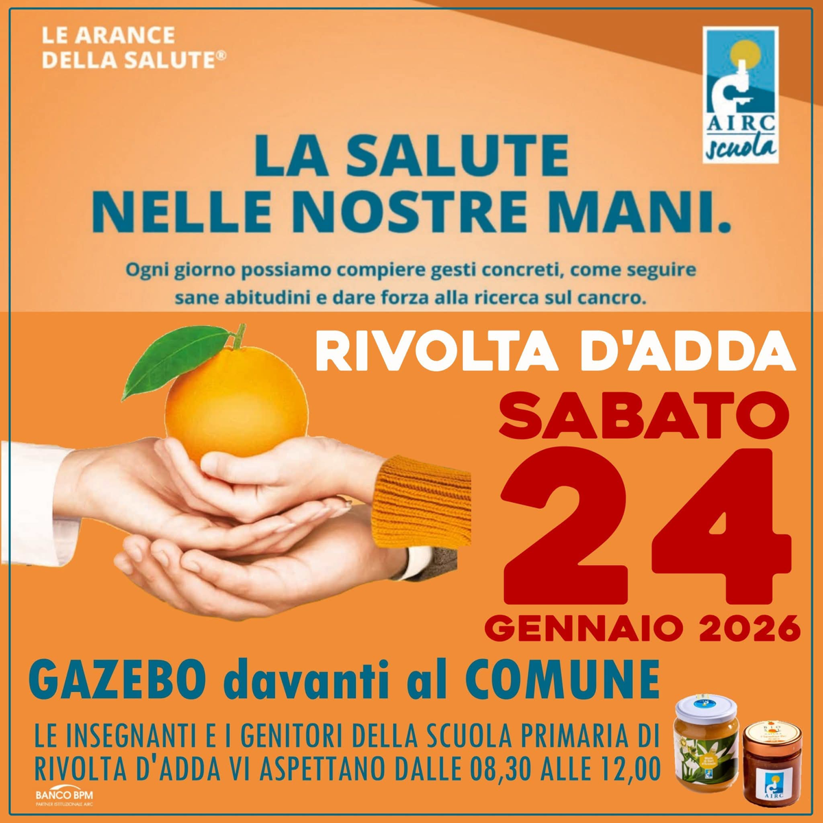 Le insegnanti e i genitori della scuola primaria di Rivolta d’Adda vi aspettano al gazebo per l’iniziativa Airc a sostegno della ricerca sul cancro, dalle 08:30 alle 12:00.