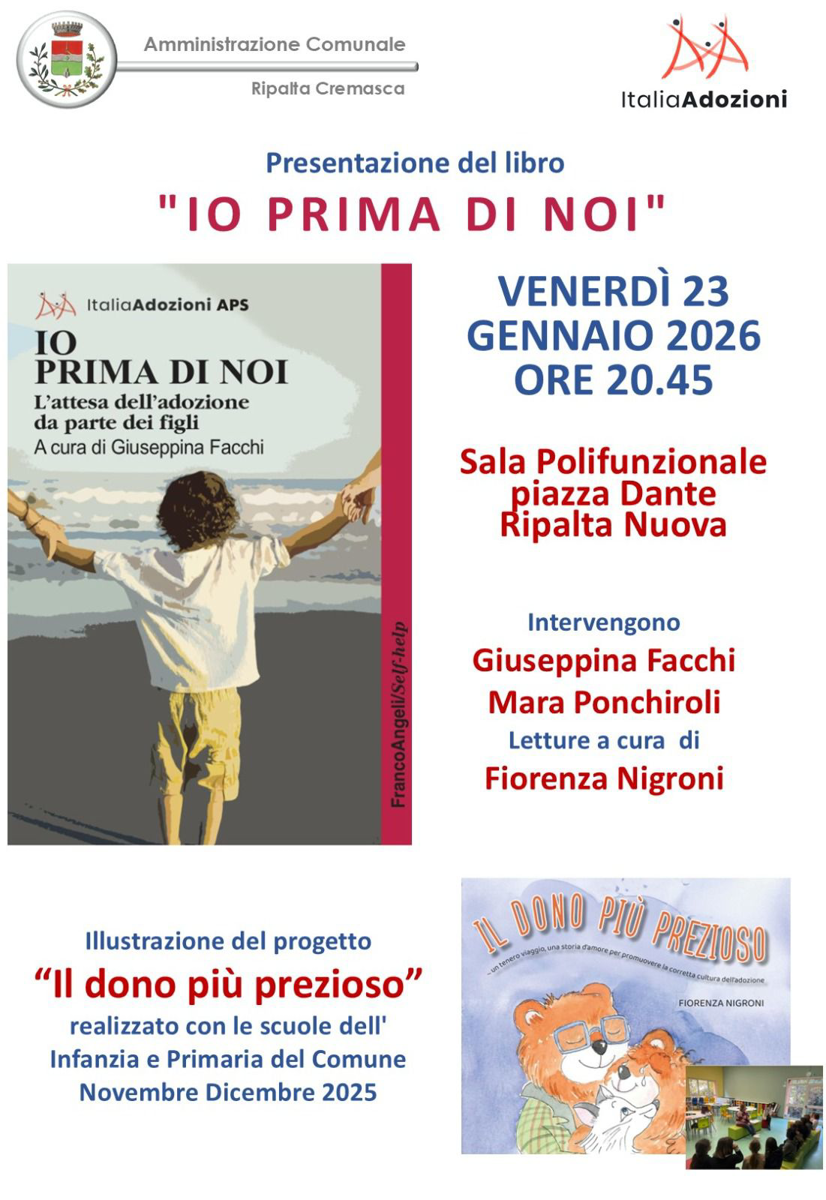 Presentazione del volume Io prima di noi – L’attesa dell’adozione da parte dei figli, a cura di Giuseppina Facchi. Intervengono Giuseppina Facchi e Mara Ponchiroli; letture a cura di Fiorenza Nigroni. Illustrazione del progetto Il dono più prezioso.