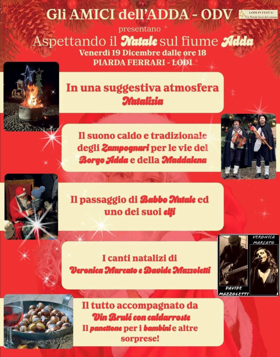 Zampognari per le vie di Borgo Adda e della Maddalena. Passaggio di Babbo Natale con un elfo. Canti natalizi di Veronica Marcato e Davide Mazzoletti. Vin brulé e caldarroste; panettone per i bambini e altre sorprese.