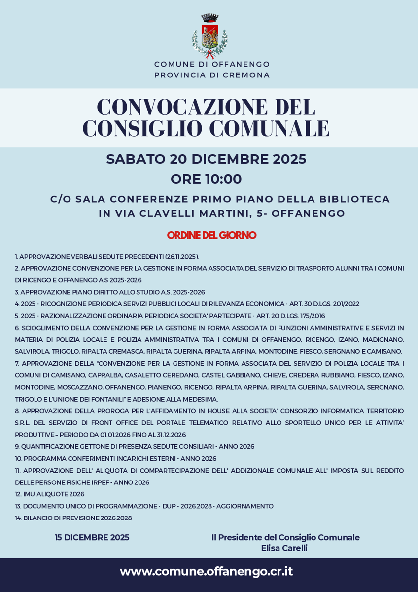 Il Consiglio comunale si riunisce per approvare la pianificazione strategica, il bilancio di previsione e la gestione dei servizi e delle tasse locali per l'anno 2026.