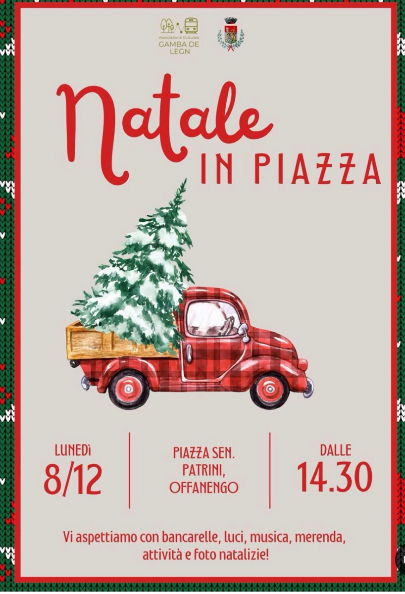 Mercatino e festa di Natale con stand di hobbisti, creativi e artigiani, prodotti tipici, cibo e bevande. Programma: 10:00 apertura del mercatino; 14:00 animazione e laboratori per bambini con il Grinch e i Folletti; 16:00 auguri del coro Note in Allegria; 17:00 accensione delle luminarie e panettone per tutti.