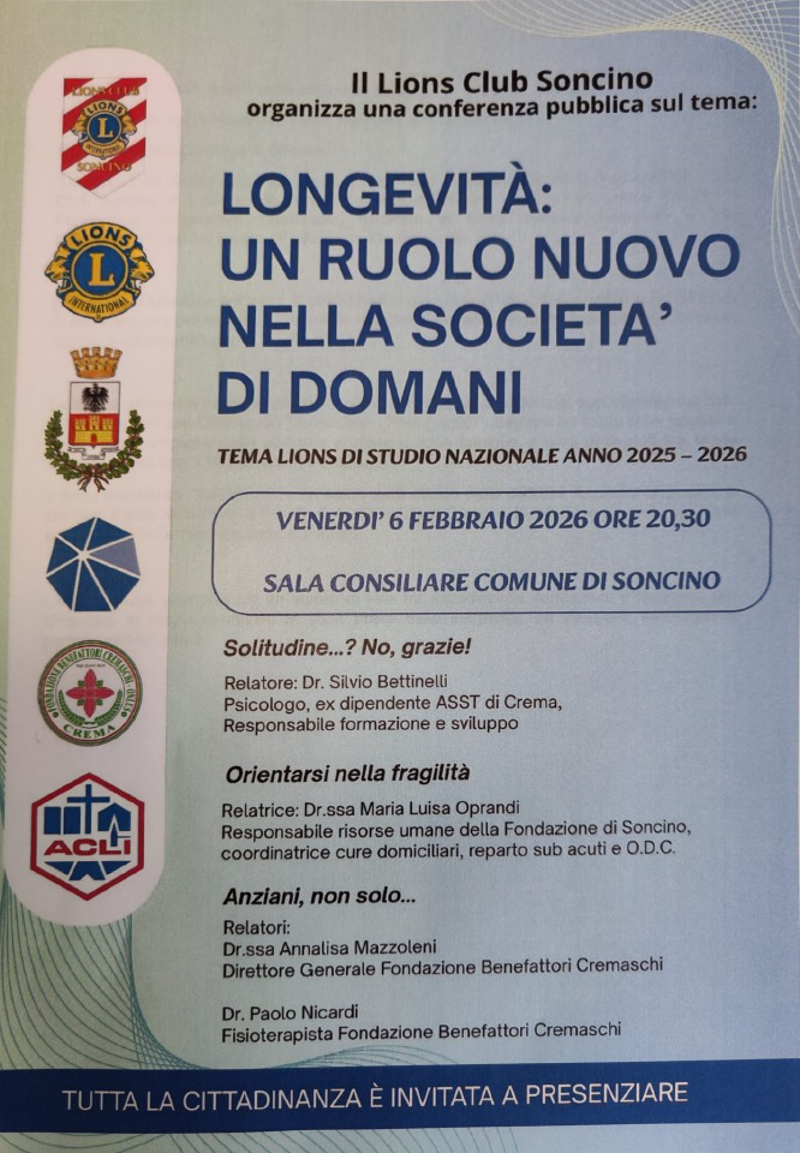 Longevità: un ruolo nuovo nella società di domani è il titolo dell'evento promosso da Lions Club Soncino in collaborazione con il comune di Soncino, Acli, fondazione Soncino e fondazione Benefattori Cremaschi, dedicato al tema dell'invecchiamento e alle trasformazioni sociali legate all'allungamento della vita.