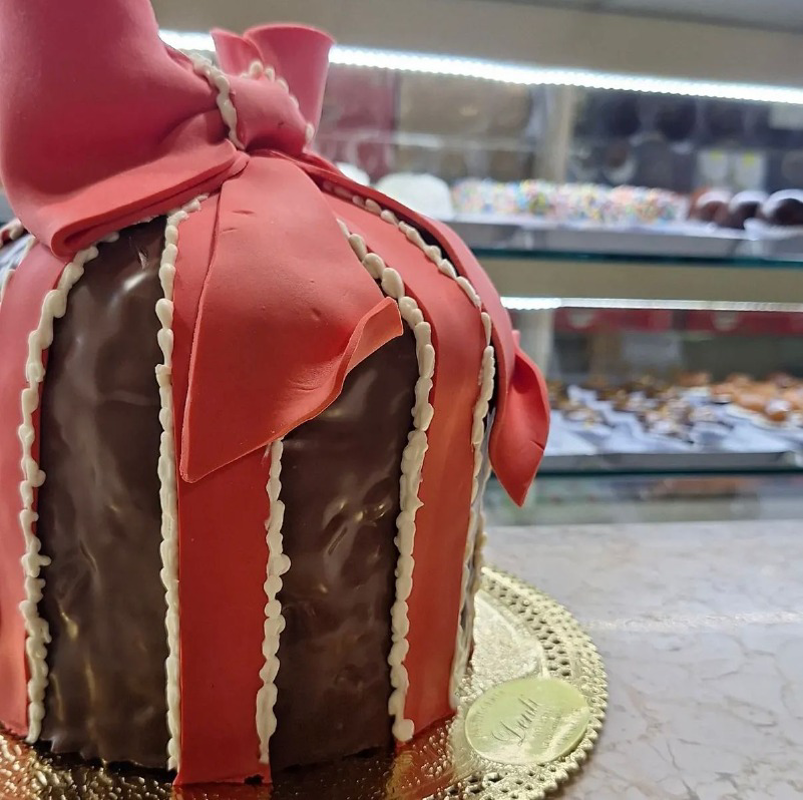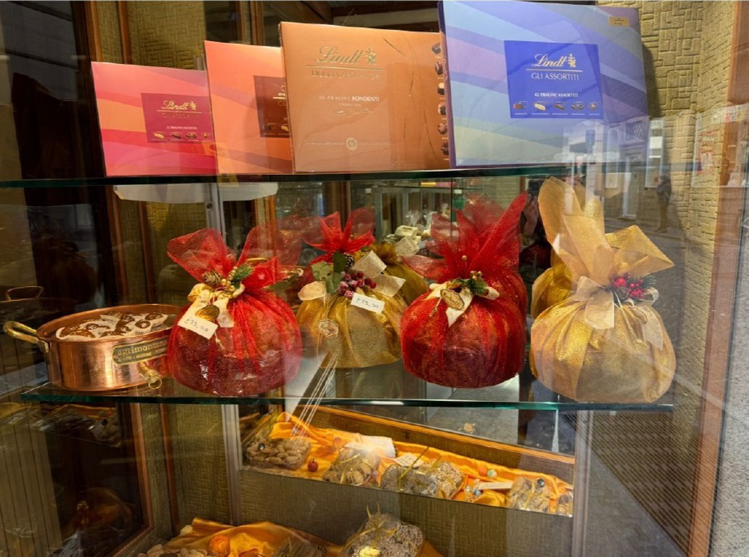 Leonardo Radaelli, della storica pasticceria in via Mazzini, sfoggia i suoi panettoni tradizionali vestiti a festa, infiocchettati con i colori natalizi rosso e dorato, mentre Denti Roberto, in via XX Settembre, come sempre delizia i passanti con i suoi panettoni farciti e minuziosamente decorati con le varie tipologie di cioccolato: presepi, paesaggi, figure geometriche e quest’anno, un panettone tutto infiocchettato che sembra proprio un dono.
