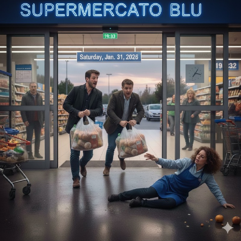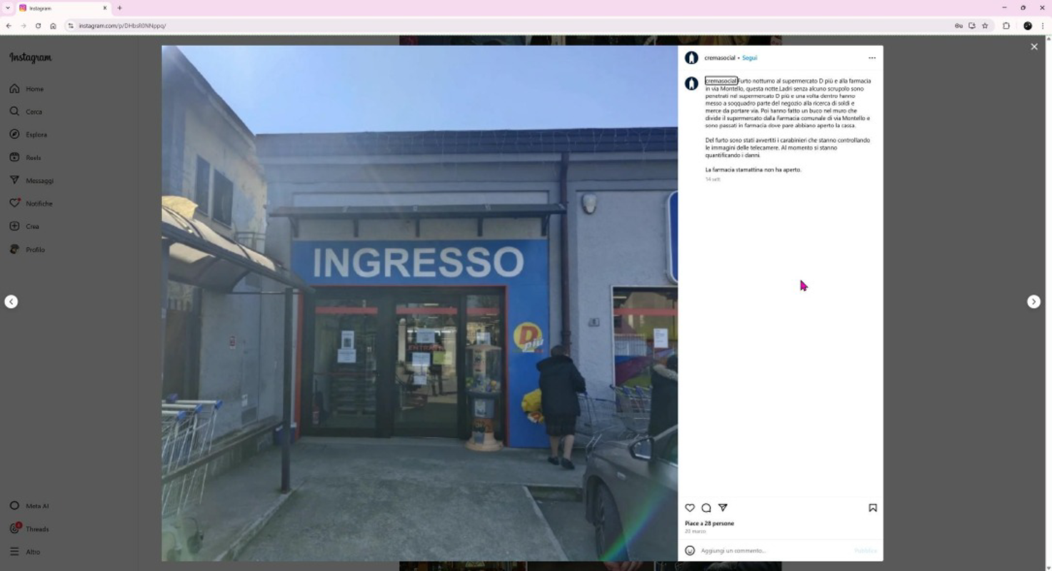 Oggi pomeriggio intorno alle 14.30 due uomini sono entrati nel supermercato D Più, hanno preso alcuni alimentari e poi hanno passato la cassa senza pagare. La commessa si è frapposta tra di loro e l'uscita e uno dei due banditi l'ha spinta facendola cadere pesantemente a terra. La ragazza ha accusato il colpo, restando a terra e i due banditi sono fuggiti. Mentre venivano chiamati i soccorsi per la commessa ferita, uno dei due banditi, quello che non aveva spinto la commessa, è tornato sui suoi passi e ha restituito la merce, scusandosi e scappando.Poco dopo con un'ambulanza della Croce Verde di Crema, la commessa è stata soccorsa e portata in ospedale a Crema, dove è stata accolta in codice giallo e curata per i dolori che accusava alla schiena.