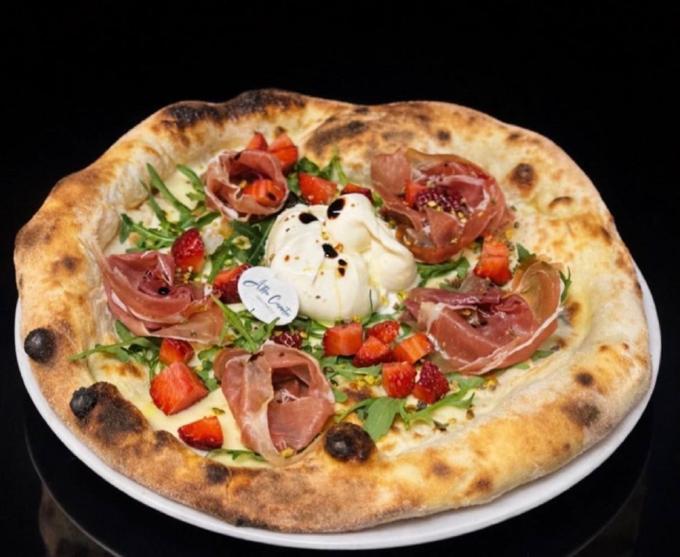 Per la base un impasto diretto con 30 ore di lievitazione in stile napoletano contemporaneo, che accoglie ingredienti ricercati in un equilibrio di sapori: fiordilatte, rucola, Rose di prosciutto di Parma Dop 18 mesi, burrata, granella di pistacchio e, per finire, il tocco speciale con fragole fresche e gocce di aceto balsamico.