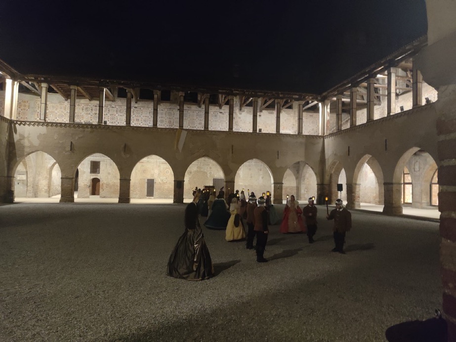 E in una serata del genere, poteva mancare una coreografia degna del contesto? Certo che no. Ecco allora che al termine della conferenza e prima della cena a buffet nella sala-banchetti offerta dal comune, nell’arena interna del castello le Dame Viscontee, sempre splendide nei loro altrettanto splendidi costumi, hanno dato vita a un suggestivo spettacolo.