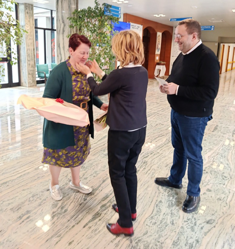 La Fondazione, come avviene per tutti i dipendenti che vanno in pensione, le ha regalato un bouquet di fiori con una lettera di ringraziamento da parte del consiglio d’amministrazione. A questo dono si sono aggiunti i regali dei vari gruppi di dipendenti più un grande ed univoco in bocca al lupo per una buona e meritata pensione.