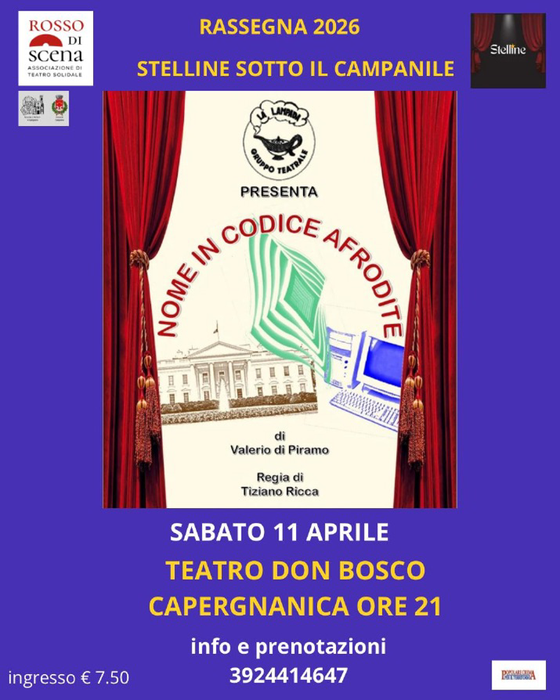 Torna sabato prossimo, nel teatro Don Bosco, la rassegna Stelline sotto il campanile. Sul palcoscenico del teatro, dalle ore 21, la compagnia La Lampada di Pompiano in scena Nome in codice Afrodite, di Valerio di Piramo, per la regia di Tiziano Ricca. "Nome in codice Afrodite" è una commedia brillante che ruota attorno a Jacopo Cirulli, un informatico che lavora da casa assistito da Alexa, un'intelligenza artificiale.