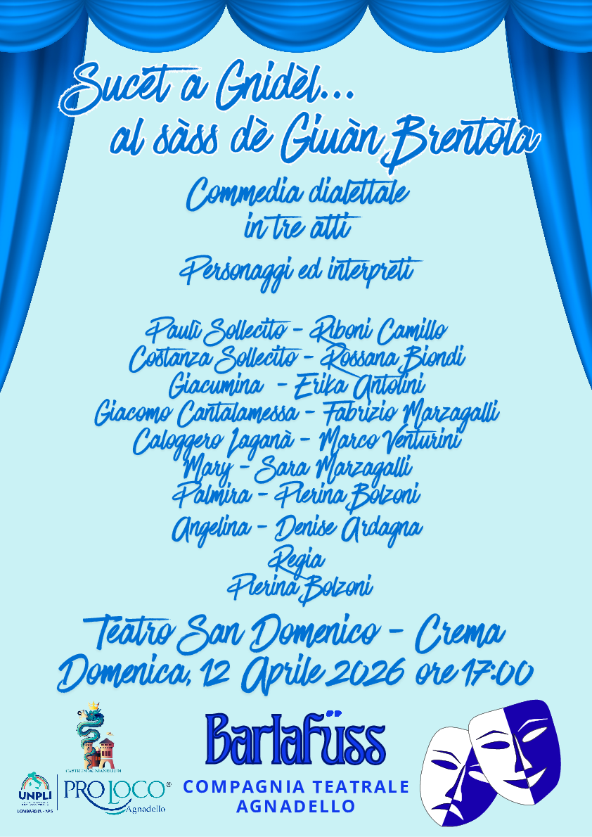 Per la stagione Stelline in scena, domenica 12 aprile alle 17, al teatro s. Domenico, debutto della compagnia I Barlafuss di Agnadello con la loro ultima commedia Suced a Gnidel al sass de Giuan Bertòla, in dialetto cremasco. Siamo a Agnadello, un piccolo paese di provincia di un'Italia che corre. Qui, tra un trasloco e una consegna, opera la piccola e sgangherata impresa di Paulì Sollecito, un uomo rude ma dal cuore d'oro che gestisce l'attività insieme alla pragmatica sorella, Costanza.