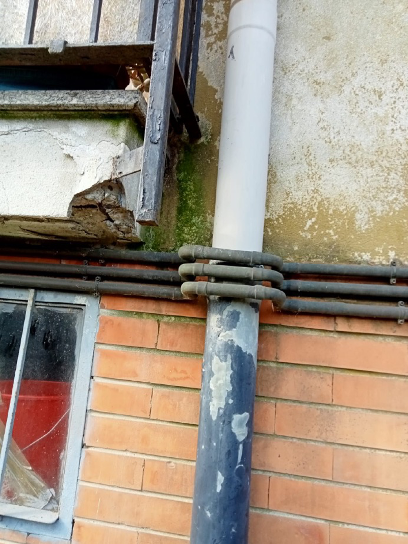 Gli inquilini della palazzina non sanno più a chi rivolgersi: "Siamo totalmente dimenticati. In alcune stanze dobbiamo alzare le tapparelle solo a metà per la paura che si rompano del tutto. In aggiunta, ci sono pezzi di intonaco che si staccano dai balconi a causa dell'umidità".