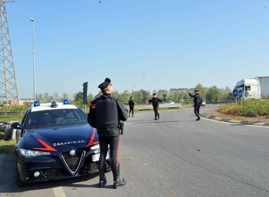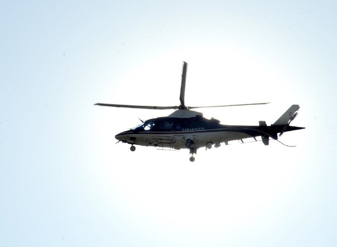 Elicottero a volo radente, sirene e auto dei carabinieri in strada.