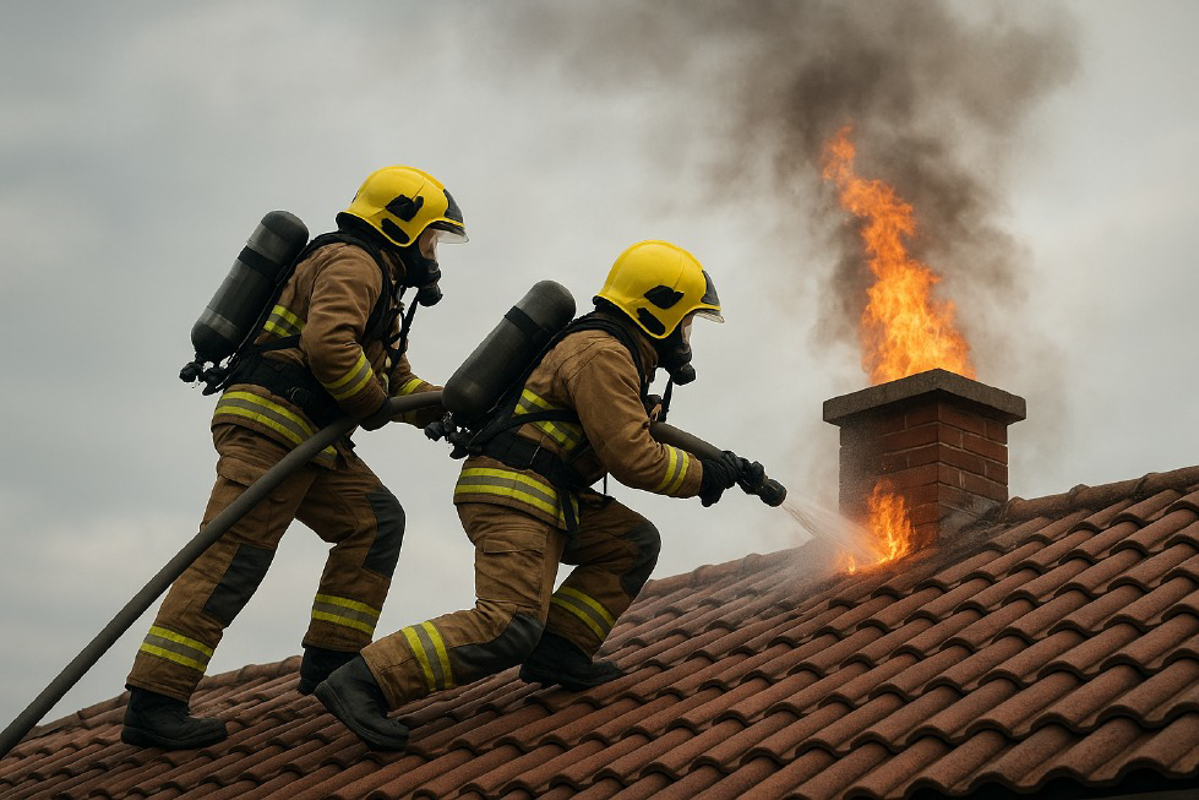 Primo intervento dei vigili del fuoco per un tetto che è andato a fuoco a causa del camino di casa.