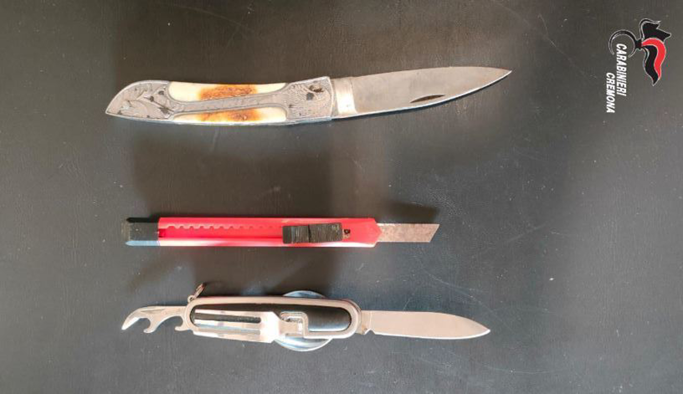 Un 22enne di Crema nella serata di mercoledì ha creato scompiglio nella parte esterna di un locale pubblico cittadino. Il giovane era ubriaco e se l'è presa prima con i clienti e poi con le sedie e i mobili del locale. All'arrivo dei carabinieri, erano le 22.30, ha dato in escandescenze, insultandoli e spingendoli e impedendo loro di farsi perquisire. Poi ha preso le sedie e ha cominciato a lanciarle dappertutto, fin tanto che i militari , che avevano visto il manico di un coltello spuntare da una tasca del 22enne, sono riusciti a bloccarlo, a perquisirlo e a prendere le armi. Così i carabinieri hanno scoperto che in tasca il 22enne non aveva un solo coltello, ma due e un taglierino.
