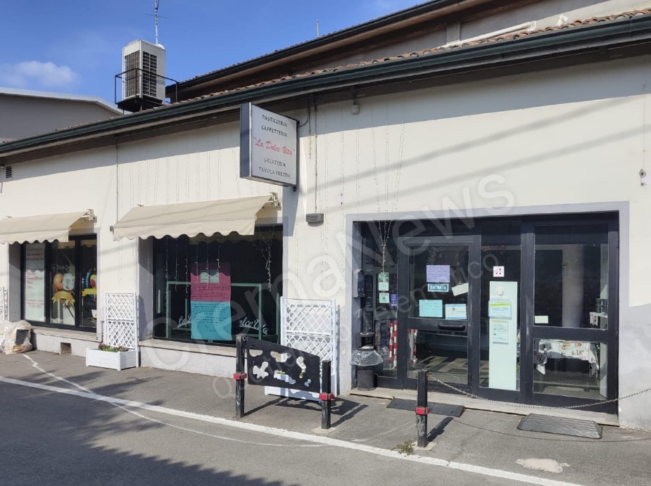 Nelle foto, la pasticceria e i cartelli esposti dal proprietario, Paolo Carioni Barbieri