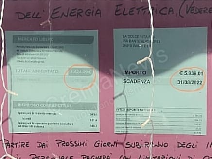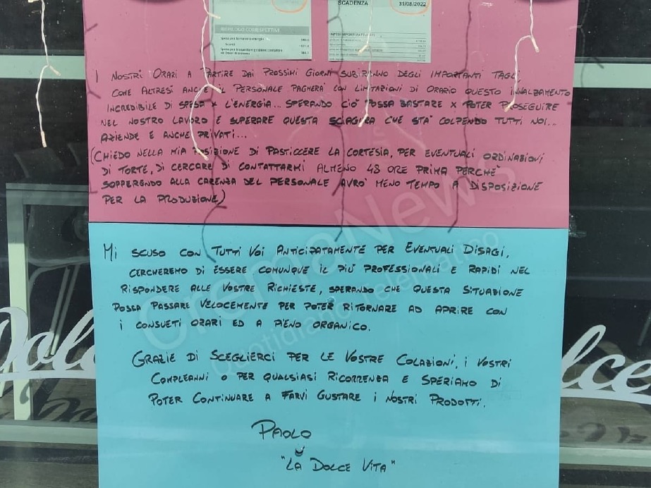 Il pasticcere, che domattina riapre dopo quattro giorni di ferie in montagna, prima di partire ha esposto un cartello nel quale chiede scusa ai clienti, li invita a fare gli ordini per tempo e si giustifica dicendo che deve ridurre il personale perché non avrà di che pagarli, viste le esorbitanti bollette che gli stanno arrivando. Ed espone due bollette a paragone: quella dell'agosto dello scorso anno, che ammonta a 1474,06 euro e quella dello stesso mese ma di quest'anno che arriva a 5939,01 euro.