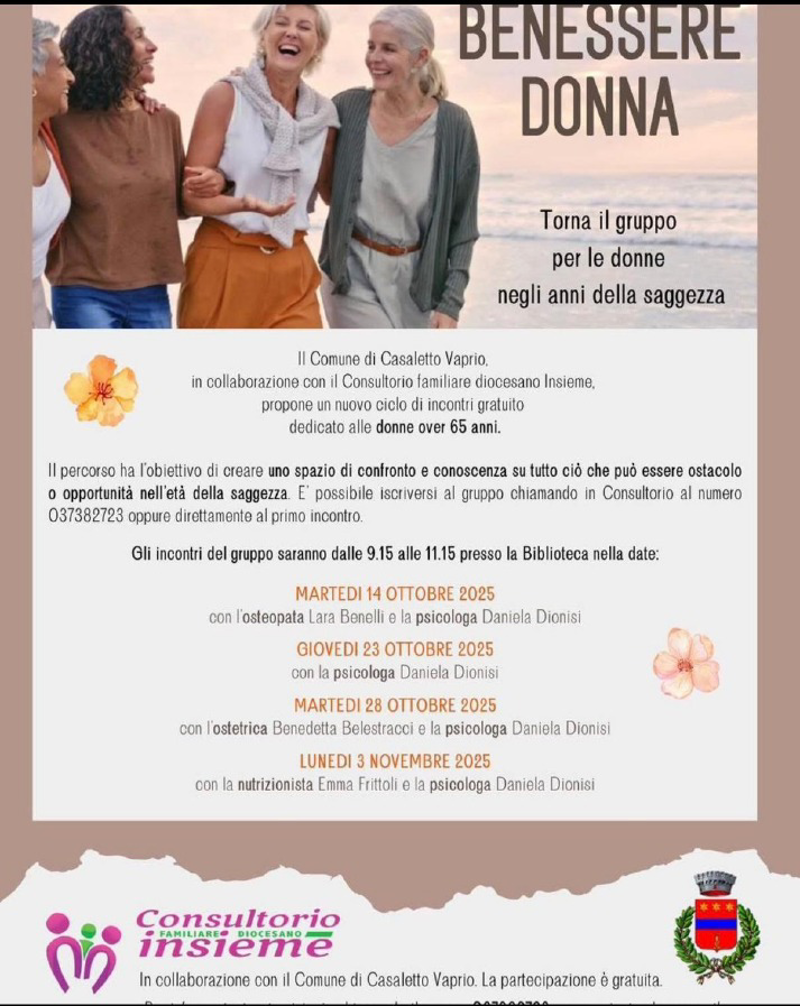 Gruppo gratuito per donne over 65. Incontro con la psicologa Daniela Dionisi.