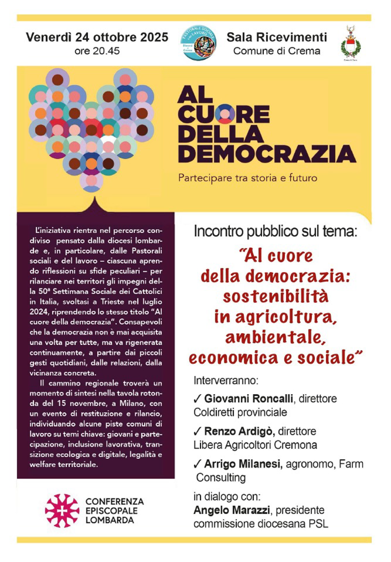 Intervengono Giovanni Roncalli (direttore Coldiretti provinciale), Renzo Ardigò (direttore Libera Agricoltori Cremona) e Arrigo Milanesi (agronomo, Farm Consulting); in dialogo con Angelo Marazzi (presidente commissione diocesana PSL).