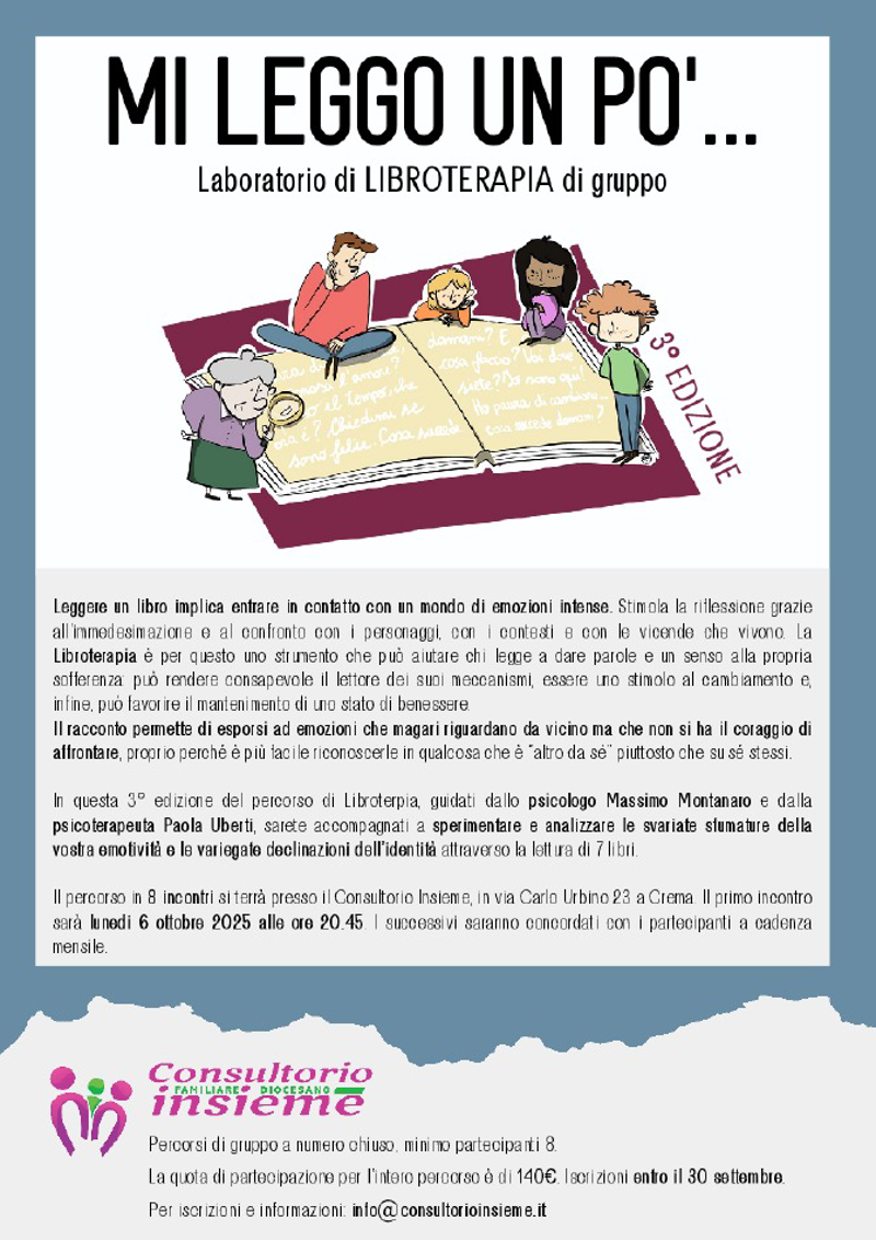 Percorso di libroterapia di gruppo guidato dallo psicologo Massimo Montanaro e dalla psicoterapeuta Paola Uberti. Otto incontri a cadenza mensile; le date successive saranno concordate con i partecipanti. Lettura e condivisione di 7 libri.