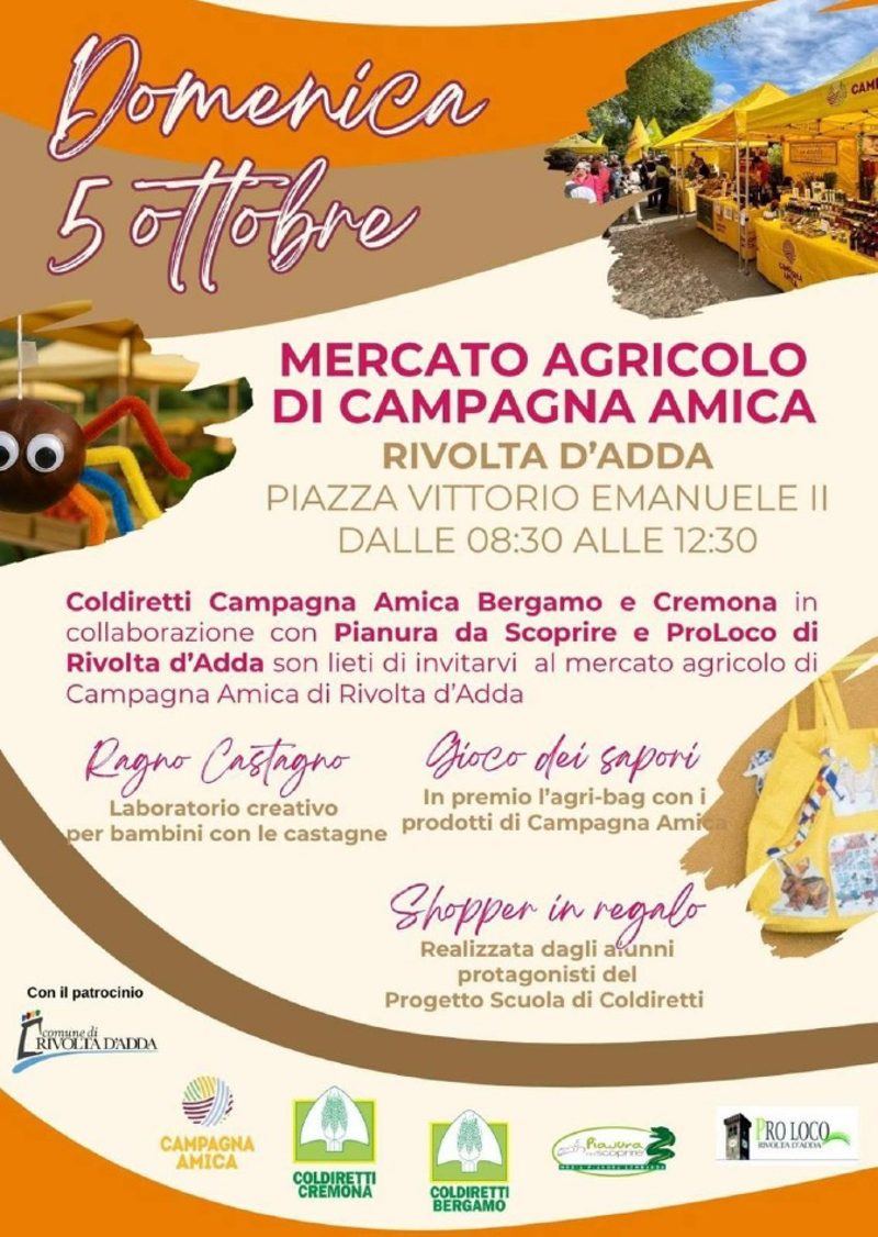 Mercato dei produttori con attività per famiglie: laboratorio per bambini “Ragno Castagno” con le castagne; “Gioco dei sapori” con in premio l’agri-bag di prodotti; shopper in regalo realizzata dagli alunni del Progetto Scuola di Coldiretti.