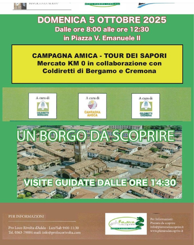 Mercato KM 0 “Campagna Amica” in collaborazione con Coldiretti di Bergamo e Cremona (8:00-12:30). Nel pomeriggio visite guidate al borgo con partenza dalle 14:30.
