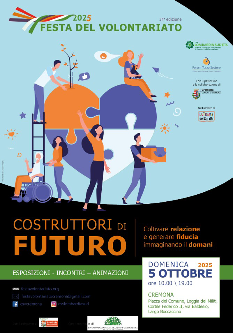 31ª edizione della Festa del Volontariato con esposizioni, incontri e animazioni. Tema “Costruttori di futuro”.