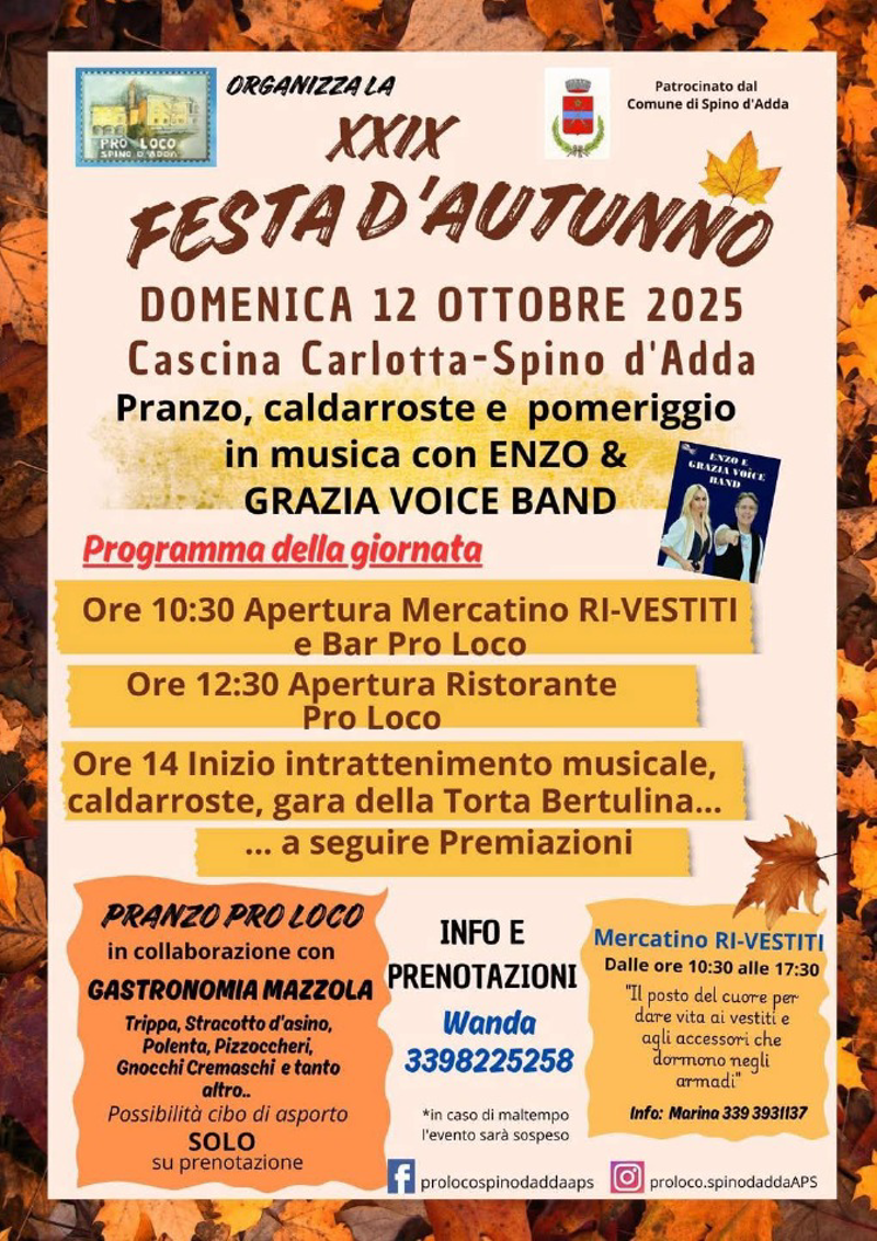 Pranzo, caldarroste e pomeriggio in musica con Enzo & Grazia Voice Band. Programma: ore 10:30 apertura Mercatino e bar pro loco; ore 12:30 apertura ristorante; ore 14:00 intrattenimento musicale, caldarroste e gara della torta Bertulina, a seguire premiazioni.