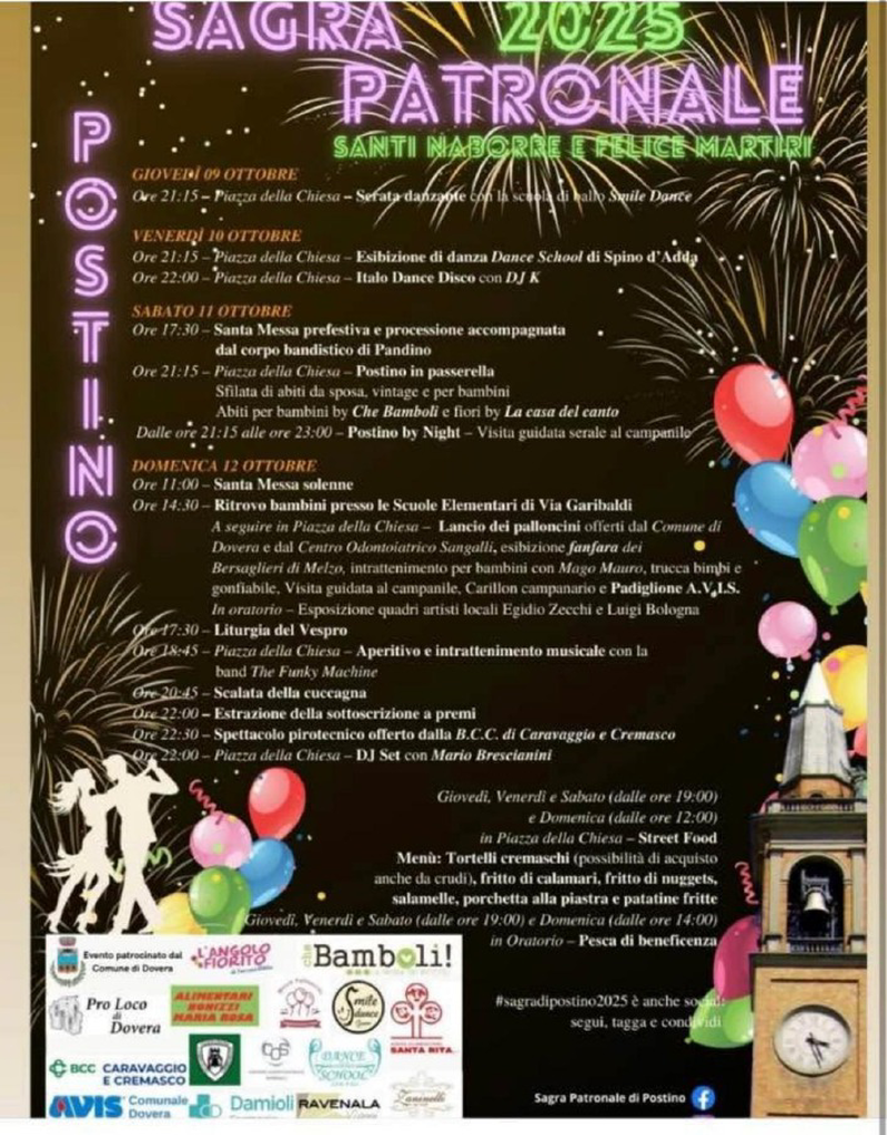 Ore 11:00 Santa Messa solenne. Ore 14:30 ritrovo bambini e a seguire in piazza lancio palloncini, fanfara dei bersaglieri di Melzo, attività per bambini con Mago Mauro, trucca bimbi e gonfiabile; visite guidate al campanile, in oratorio esposizione di quadri di Egidio Zecchi e Luigi Bologna. Ore 17:30 liturgia del Vespro. Ore 18:45 aperitivo e musica con The Funky Machine. Ore 20:45 scalata della cuccagna. Ore 22:00 estrazione sottoscrizione a premi. Ore 22:30 spettacolo pirotecnico. Per finire Dj set con Mario Bresciani in piazza. Street Food in piazza dalle 12:00. Pesca di beneficenza in oratorio dalle 14:00.