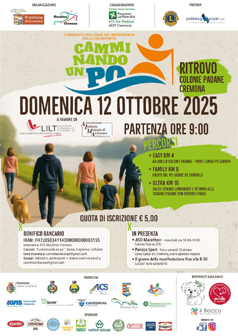 Camminata solidale con percorsi da 4km, 8km, 16km.
