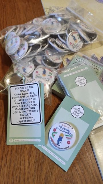 Non è tutto. Giovanni Barraco ha creato anche una spilla, in distribuzione in tutt’Italia, con il disegno di “Volontino”, avatar dei volontari di protezione civile e la scritta: “Covid 19. Io sono vaccinato”. A breve Volontino diverrà anche un magazine on line (Volontino.it) con tutte le notizie della protezione civile. L’intento è di far avvicinare le persone al gruppo, formato quasi esclusivamente da volontari, e sostenerlo in questo periodo così difficile, anche attraverso piccoli gesti come la donazione di dispositivi di protezione individuale.