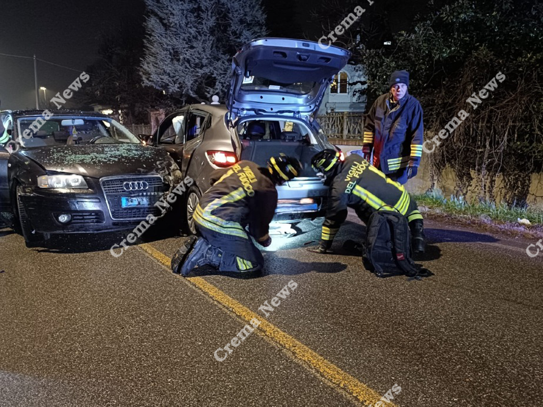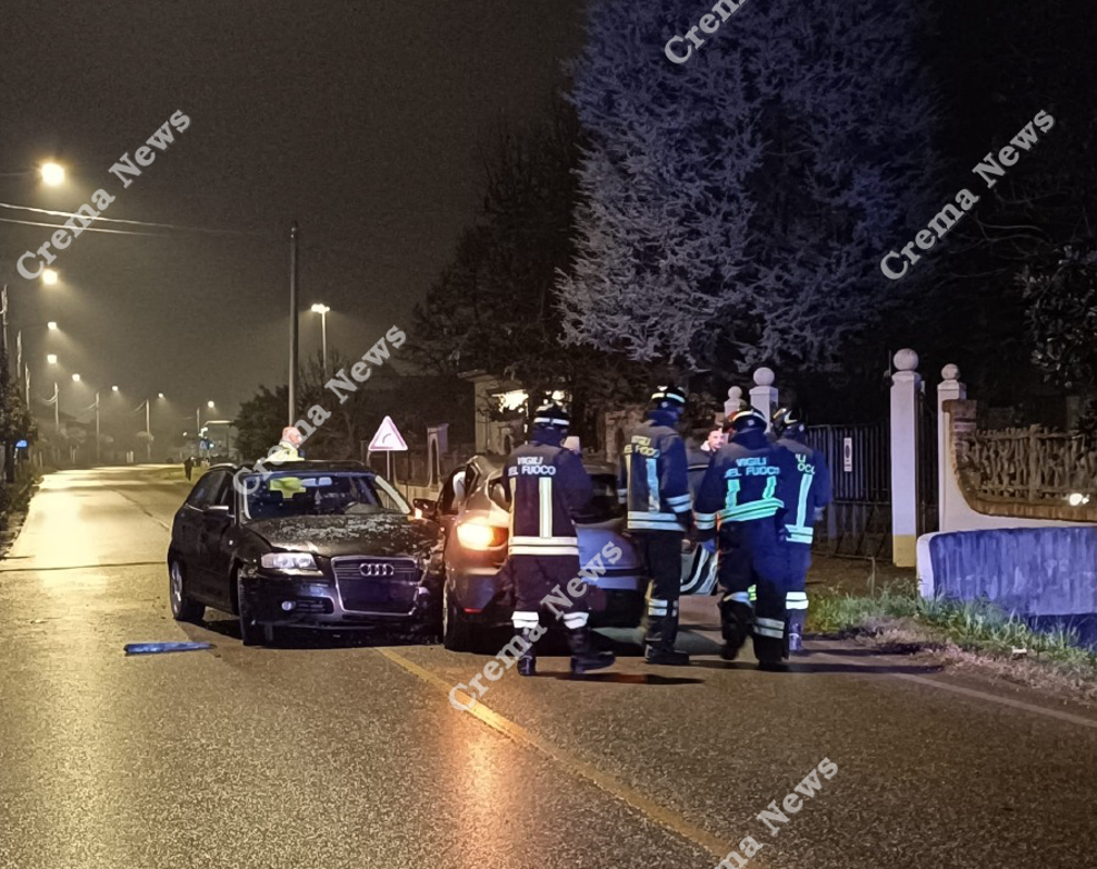 Verso. quell'ora una Audi A4 condotta da una donna di 46 anno stava viaggiando con direzione Crema quando, nell'abitato del paese, ha perso il controllo della sua auto, ha sbandato a sinistra ed andata a sbattere contro una Renault Clio con a bordo tre persone. Nell'urto la donna è rimasta ferita ed è stata soccorsa dal persona dio auto medica e ambulanza della Croce Rossa di Crema. La donna è stata trasportata nel pronto soccorso dell'ospedale di Crema dove è stata accolta in codice giallo e, su richiesta della Polstrada, intervenuta per i rilievi, è stato eseguito l'alcoltest. Intanto sul luogo dell'incidente i tre occupanti della Clio si sono dati alla fuga, abbandonando la vettura. Si stanno eseguendo indagini per capire di chi sia l'auto e perché i tre occupanti sono scappati