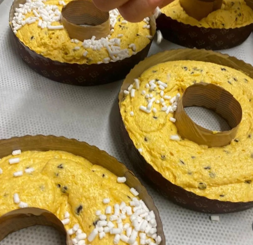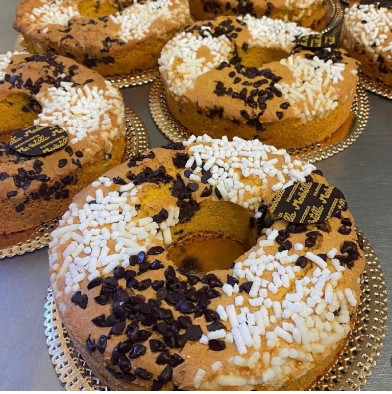 L’impasto cremoso prende la forma di una sorta di ciambella, che in superficie si arricchisce con zuccherini e gocce di cioccolato alternati.