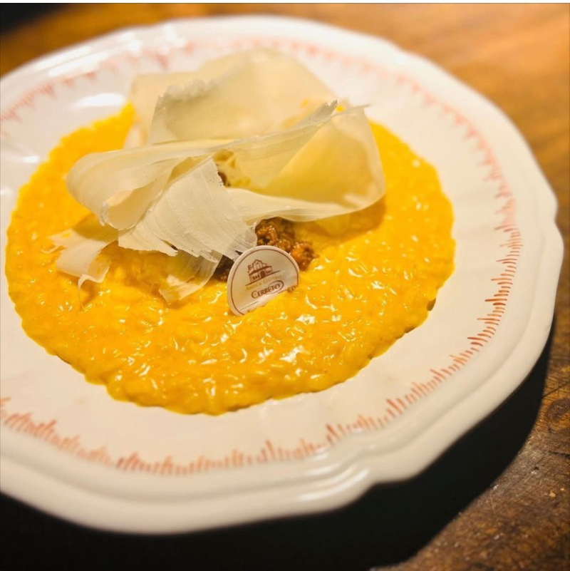 Il piatto forte della serata è il piatto più rappresentativo della location: il risotto alla Vecchia Lodi, ricetta della tradizione lodigiana depositata( con marchio registrato), cremoso e saporito. È un piatto del Buon Ricordo, preparato con ragù di salsiccia e pancetta, zafferano e sottili petali di Raspadura, come tocco finale.