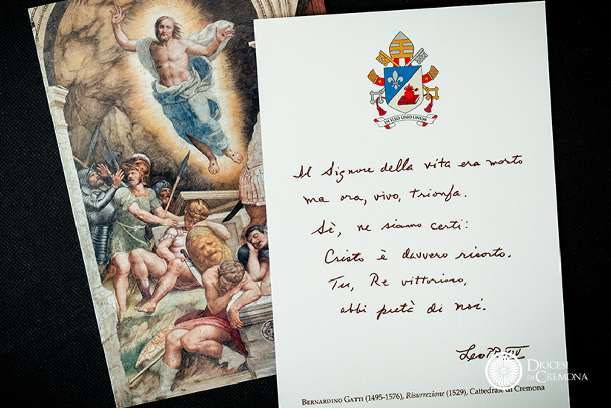 "Papa Leone XIV ci ha fatto una bella sorpresa. Quest’anno, manda i suoi primi auguri da Vescovo di Roma successore di Pietro utilizzando una bella immagine dalla cattedrale di Cremona: l’affresco della risurrezione del Signore che Bernardino Gatti dipinse nel ‘500 sulla controfacciata. Sul retro dell’immaginetta, che sta viaggiando in tutto il mondo, c’è scritto in diverse lingue: “Il Signore della vita era morto ma ora, vivo, trionfa. Sì, ne siamo certi: Cristo è davvero risorto. Tu, Re vittorioso, abbi pietà di noi” (parole tratte dalla sequenza di Pasqua).