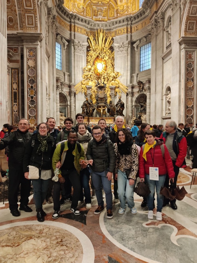 Nella foto, don Natale con un gruppo di pellegrini ieri a Roma per il Papa